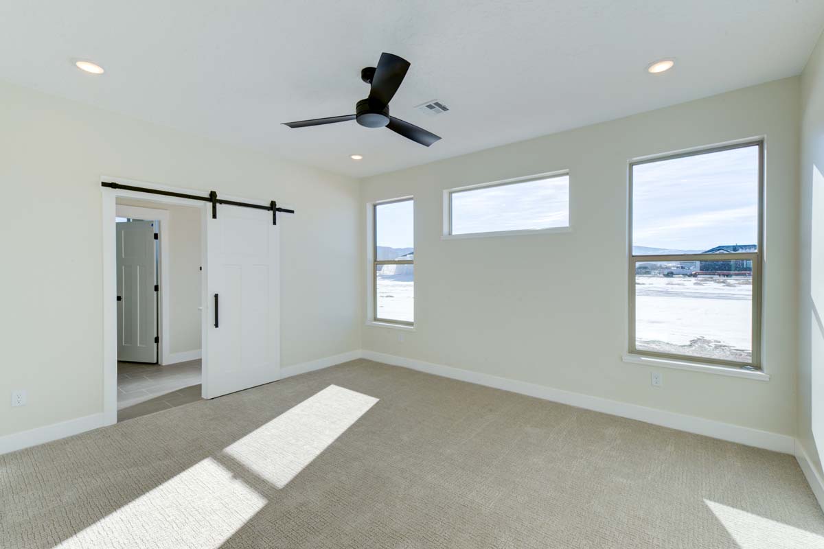 Enter into a spacious open floor plan that seamlessly combines the living, dining, and kitchen areas – a design perfect for hosting gatherings or enjoying quiet family nights in. Light floods the space through large, energy-efficient windows, reflecting off the elegant hardwood floors. The living room features a statement fireplace, adding a touch of coziness to this expansive area.